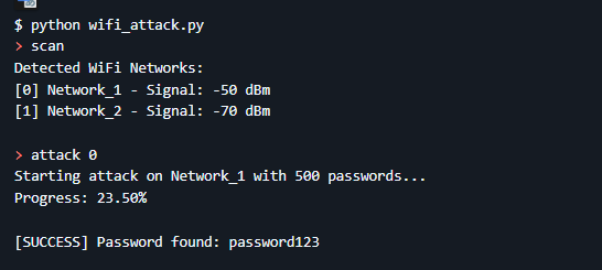 - Brute Force Attack: Performs a brute force attack on a specified WiFi network using a wordlist.